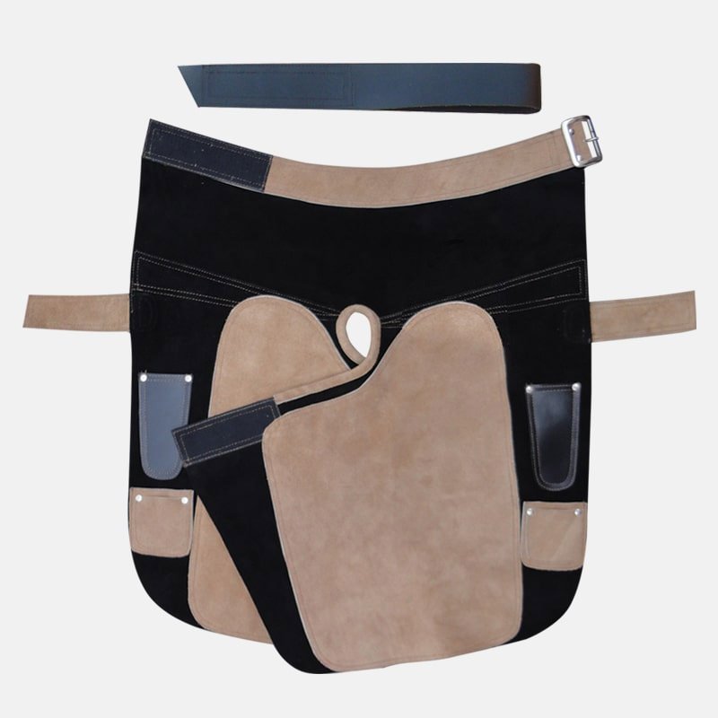 This is a brand new lightweight and durable farrier’s apron. Made from split leather and cordura fabric. Quick release plastic buckles on straps and belt. It has knife pockets. We can add magnet under left knife pocket as per customer demand. They are double stitched with nylon thread to prevent rotting from sweat and exposure.