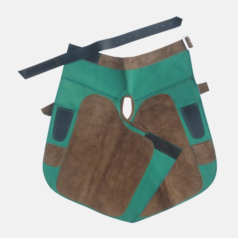 Lightweight Apron is made apron of cotton duck cloth, and chap split leather. This apron is double stitched for the best durability and longevity. The cotton duck cloth becomes quite comfortable as it forms to your movements. The leather used is extremely durable and tough, yet soft and flexible. A new style adjustable waist strap has elastic to prevent the apron from sliding off the hips, and allows for a perfect fit. Adjustable leg straps have two position snap fasteners.